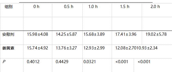 Rasyid 等[ 1 1 ]為比較姜黃素和安慰劑對健康例體膽囊的作用。將12 例受試者分為兩組進行隨機雙盲交叉研究,在給予姜黃素或安慰劑前空腹膽囊容積分別為( 15.74±4.29)mL和(15.98±4.08)mL,二者相似;分別給予20 mg姜黃素或相同量安慰劑后0.5,1.0, 1.5 和2 . 0 h 測量膽囊容積,姜黃素組膽囊容積分別降低了( 11.8±6.9)%,(16.8±7.4)%,(22.0±8.5)%,( 2 9 . 3 ±8 . 3 )% ,安慰劑組在0 . 5 h 后顯著下降,約( 10.9±22.8)%,1.0 h后膽囊容積開始增加,相關試驗數據見表1,試驗表明,姜黃素能夠誘使例體膽囊發生收縮。