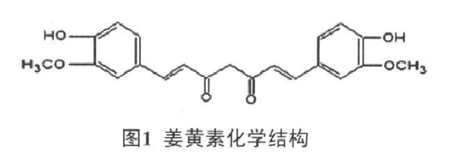 藥姜黃具有破血行氣、通經止痛之功效,有效成分為姜黃素(curcumin)、脫甲氧基姜黃素及雙脫甲氧基姜黃素,姜黃素是其中主要有效成分[1]。姜黃素曾作為香料和食物色素廣泛用于食品工業[2],其結構式見圖1。近年,姜黃素的藥理活性不斷發現,如抗炎、清除自由基及抗癌等[3],其中一些藥理作用已進入臨床驗證階段。現將近年國內外有關姜黃素的臨床研究成果作一綜述,以期為姜黃素的應用與開發研究提供參考。