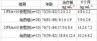 隨機將85例受試者分成兩組進行雙盲試驗,根據受試者血中PSA水平,以10 ng/mL為界分成2組。1組(PSA≤10 ng/ mL):安慰劑32例,給藥28例;2組(PSA>10 ng/mL):安慰劑10例,給藥15例,試驗6個月。2組給藥的15例其PSA顯著下降,由治療前的(18.8±12.4) ng/mL降至治療后的(10.2±6.2) ng/mL,見表2。表明姜黃素和大豆異黃酮能通過抗雄激素作用,抑制前列腺細胞中PSA產生,調節血中PSA水平。